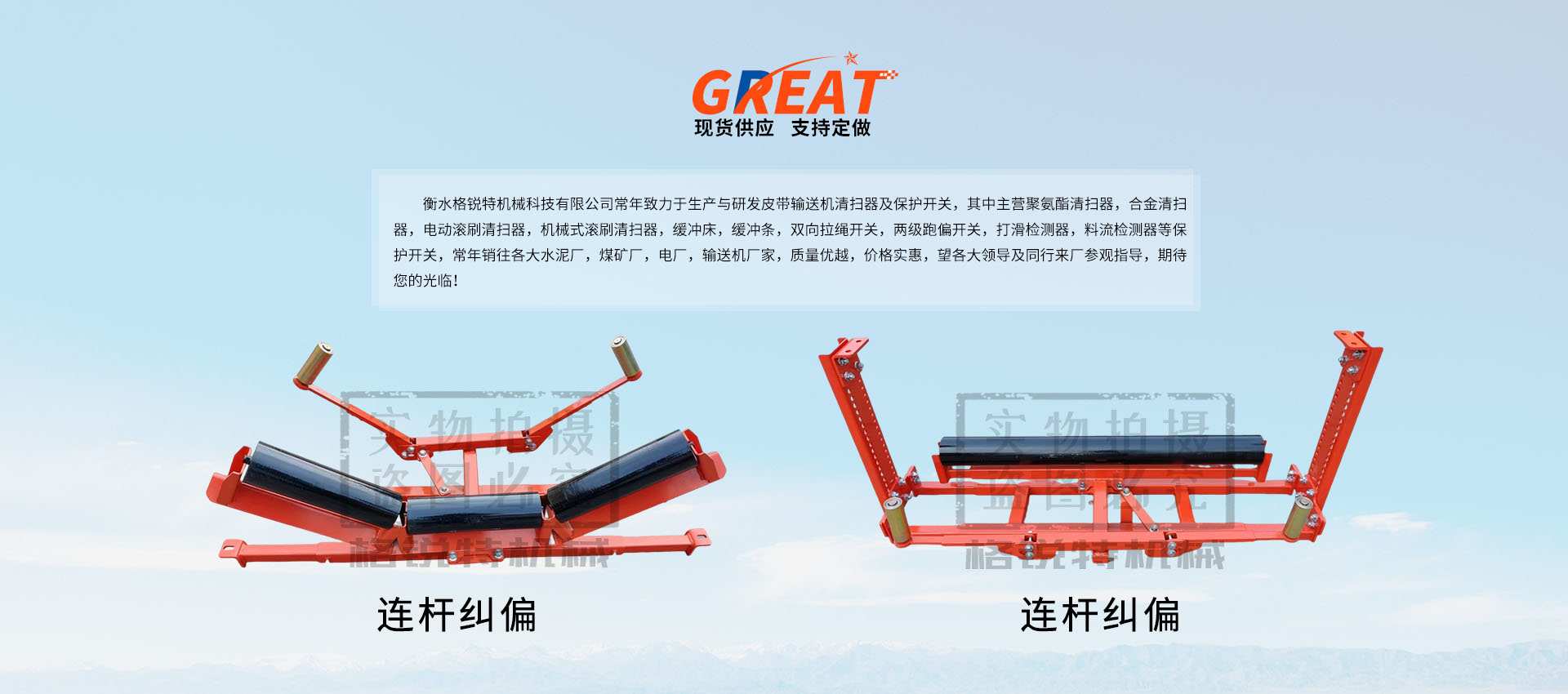 衡水格銳特機械科技有限公司常年致力于生產(chǎn)與研發(fā)皮帶輸送機清掃器及保護開關,其中主營聚氨酯清掃器,合金清掃器,電動滾刷清掃器,機械式滾刷清掃器,緩沖床,緩沖條,雙向拉繩開關,兩級跑偏開關,打滑檢測器,料流檢測器等保護開關,常年銷往各大水泥廠,煤礦廠,電廠,輸送機廠家,質(zhì)量優(yōu)越,價格實惠,望各大領導及同行來廠參觀指導,期待您的光臨?。?!